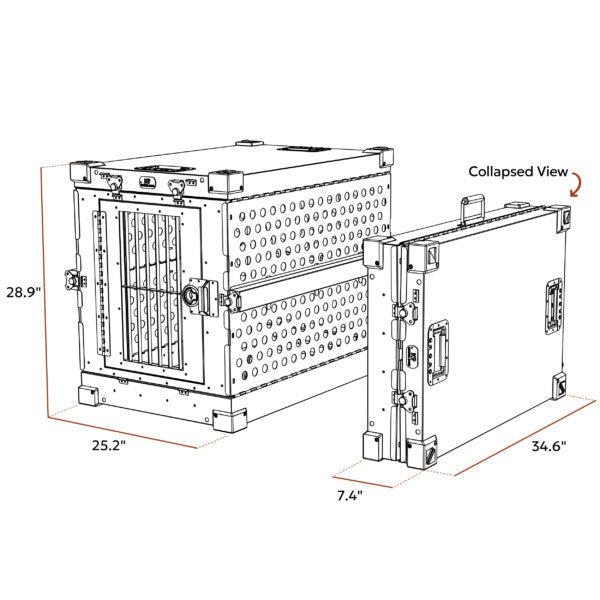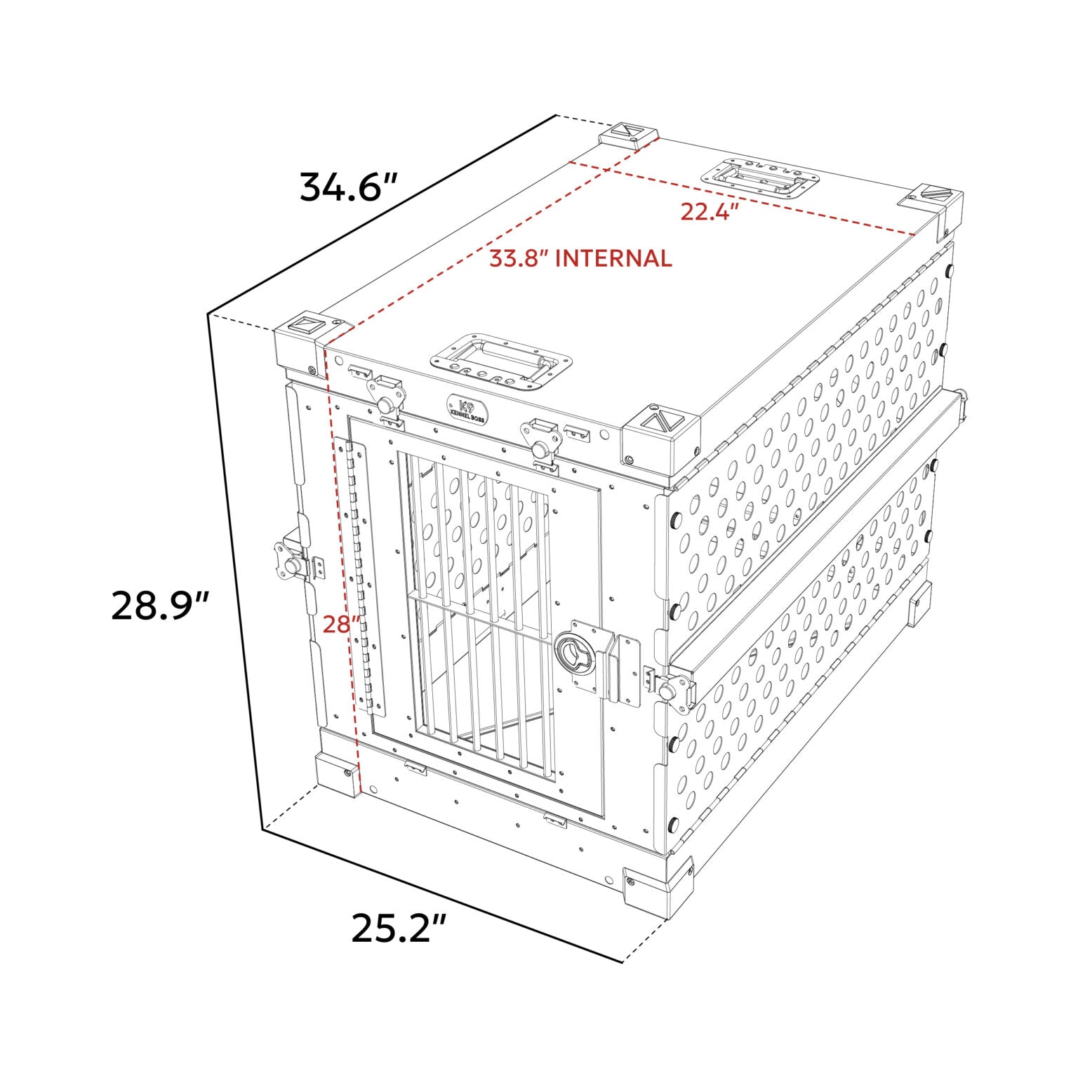 The K9 Kennel Boss collapsible dog crate is engineered to keep your dog safe and contained. With its lightweight aluminum construction, commercial-grade hardware, and high-quality powder-coated finish, this sturdy design helps prevent dog escapes and is easy to clean. The collapsible design easily transitions from assembled to suitcase configuration in under a minute with no additional tools required. Built-in handles allow for easy transporting or storing of the crate when not in use.