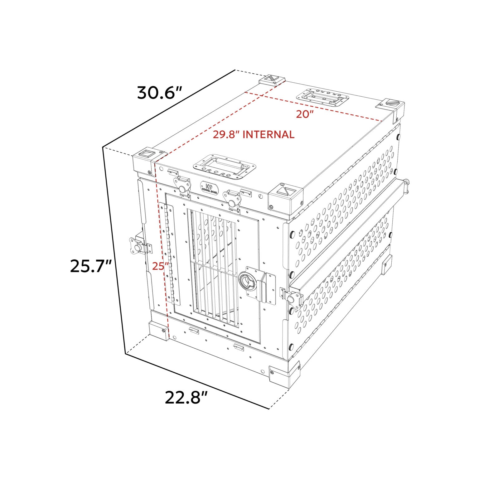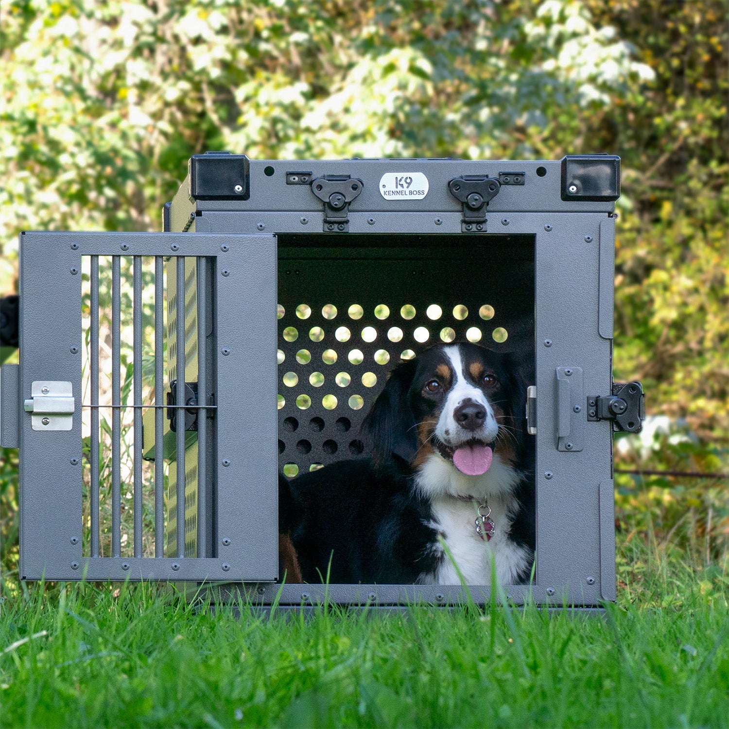 The K9 Kennel Boss collapsible dog crate is engineered to keep your dog safe and contained. With its lightweight aluminum construction, commercial-grade hardware, and high-quality powder-coated finish, this sturdy design helps prevent dog escapes and is easy to clean. The collapsible design easily transitions from assembled to suitcase configuration in under a minute with no additional tools required. Built-in handles allow for easy transporting or storing of the crate when not in use.